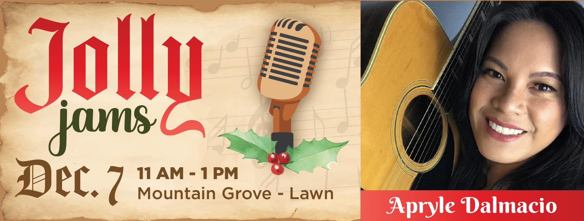Kick off the holiday season with the soulful sounds of Apryle Dalmacio at the Mountain Grove Lawn. Enjoy a cozy Sunday morning filled with cheerful tunes, perfect for shopping and soaking in the festive spirit.
