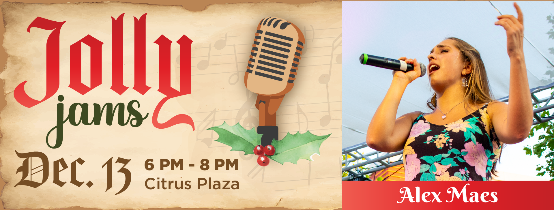 Enjoy an evening of live holiday music with Alex Maes at Citrus Plaza. Her soulful energy and warm vocals will add the perfect soundtrack to your holiday shopping night out.