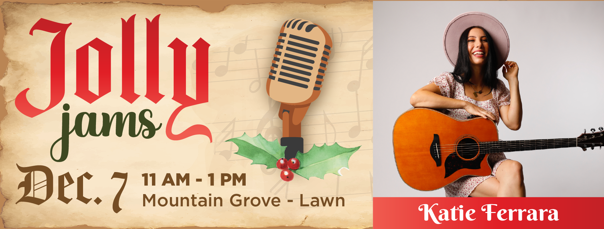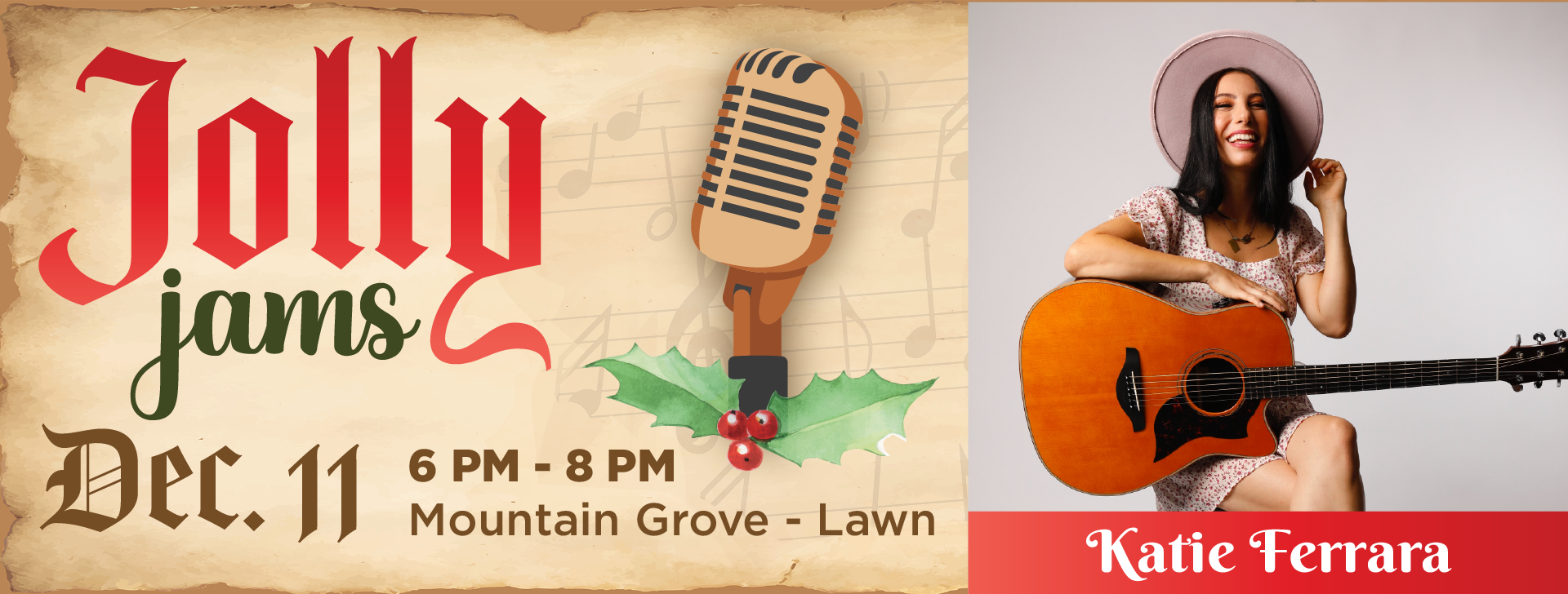 Kick off the holiday season with the soulful sounds of Katie Ferrara at the Mountain Grove Lawn. Enjoy a cozy Sunday morning filled with cheerful tunes, perfect for shopping and soaking in the festive spirit.