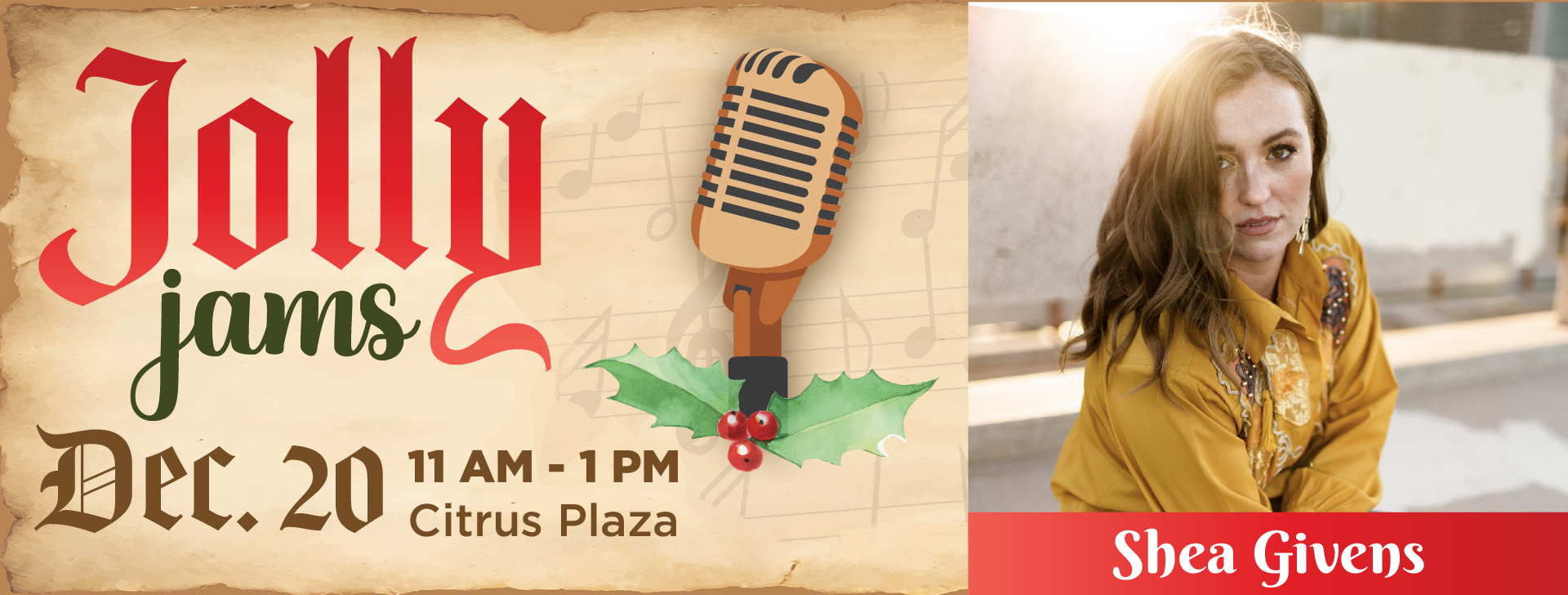 Enjoy your weekend shopping with a joyful performance by Shea Givens at Citrus Plaza. Her holiday melodies will make your morning extra merry.