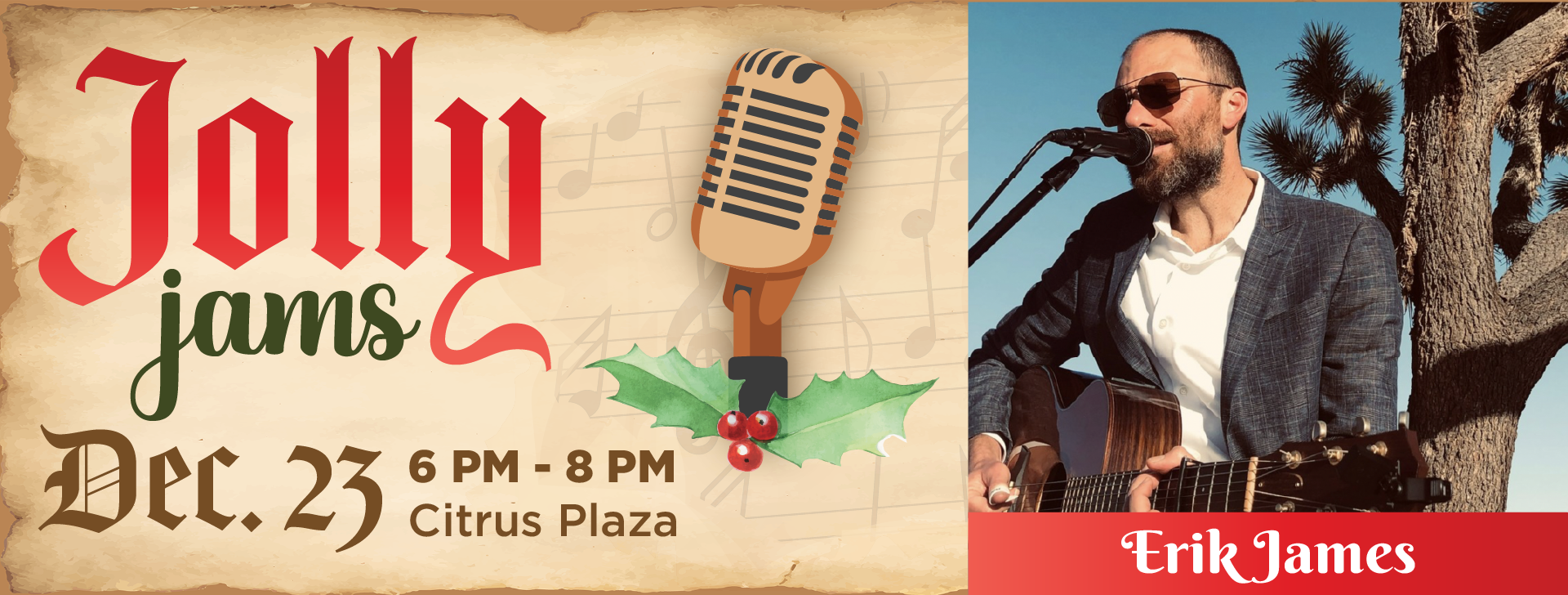 Close out the Jolly Jams series with a festive finale featuring Erik James at Citrus Plaza. Enjoy his vibrant performance as you wrap up your holiday shopping in style.
